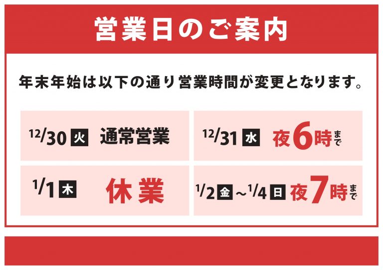 標記店舗につきまして、年末年始の営業時間は以下の通りとさせていただきます。