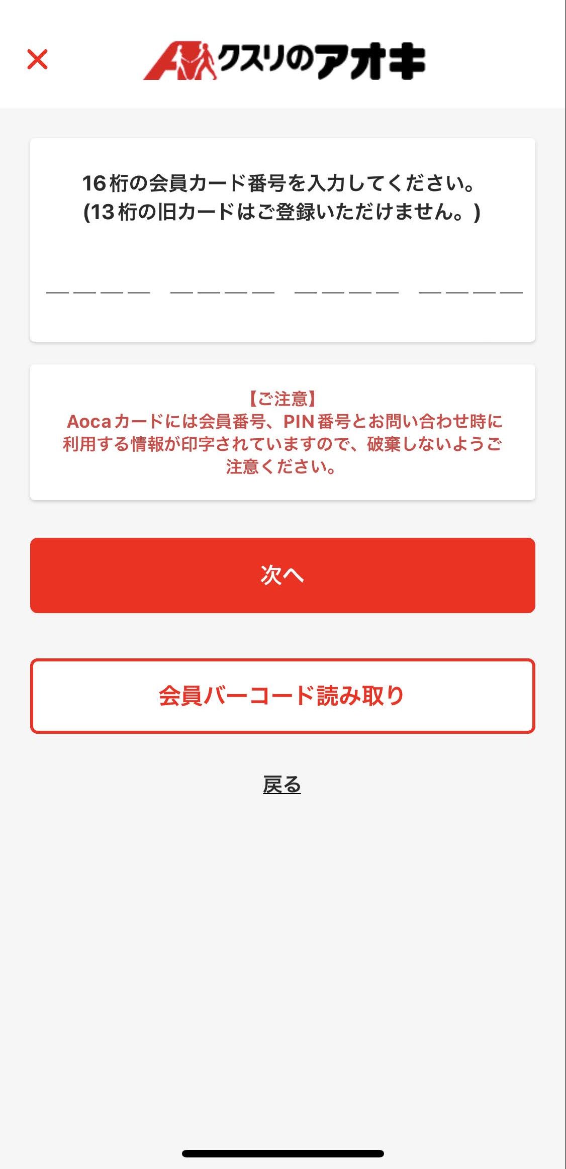 店舗で作成したカードのバーコードを読み取るか、直接カード裏面またはメールに記載のある16桁の会員番号を入力し「次へ」をタップ