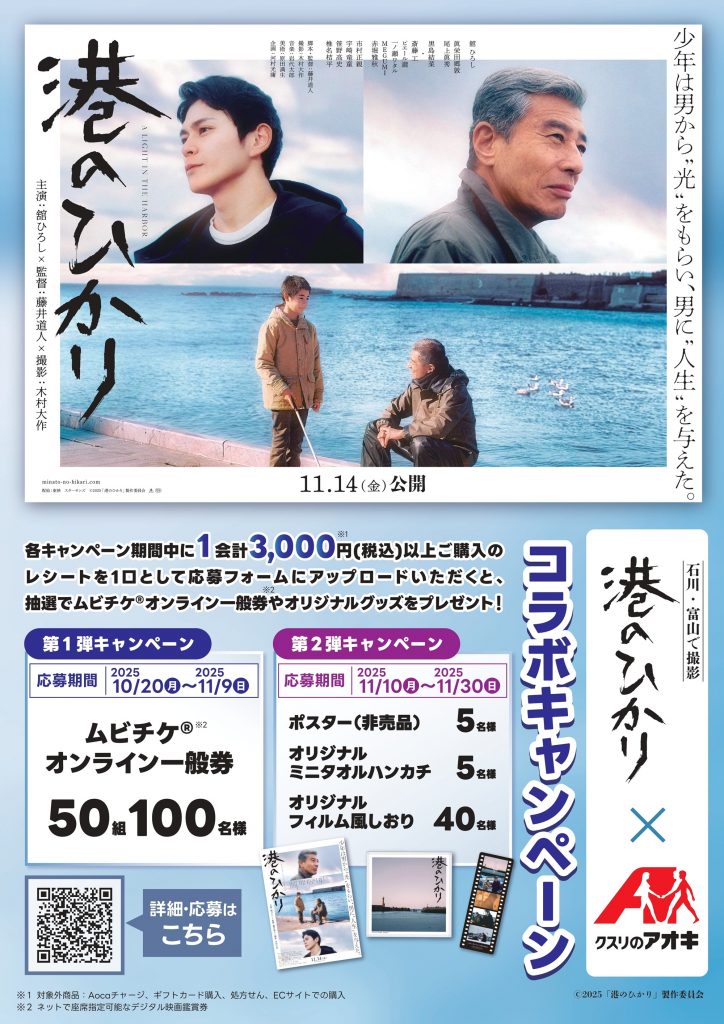 この秋公開の映画『港のひかり』とクスリのアオキ コラボキャンペーンを実施します。1会計3000円(税込)以上のレシートを1口として応募フォームにアップロードいただくと、抽選でムビチケオンライン一般券のほか、ポスター(非売品)やオリジナルミニハンカチなどのオリジナルグッズをプレゼント!詳細は下記よりご確認ください。